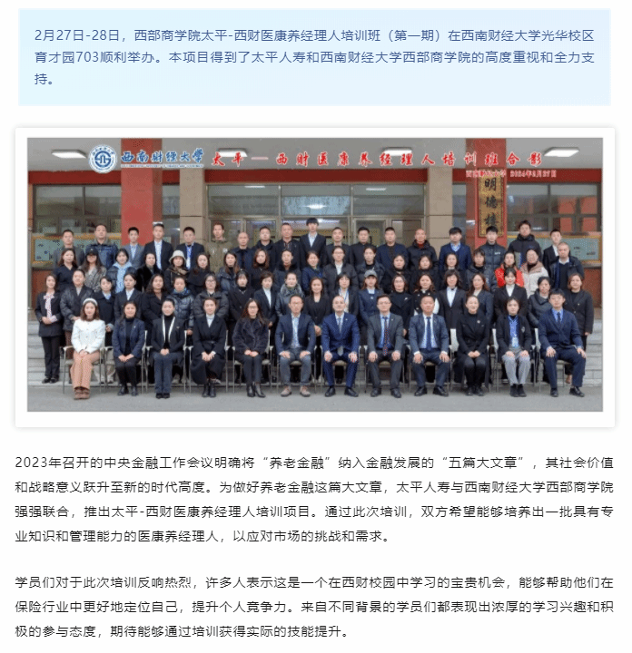 做好养老金融大文章︱太平-西财医康养经理人培训班(第一期)圆满举办