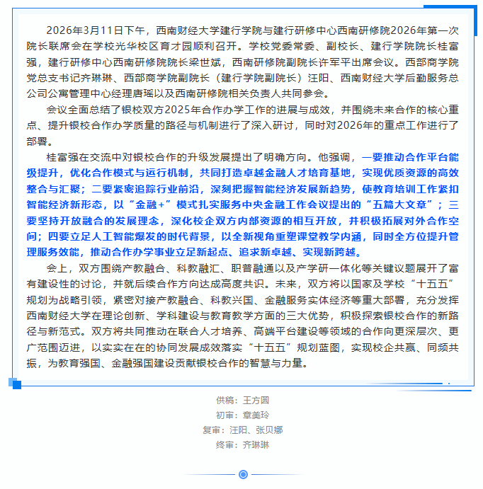 西南财经大学建行学院与建行研修中心西南研修院召开2026年第一次院长联席会