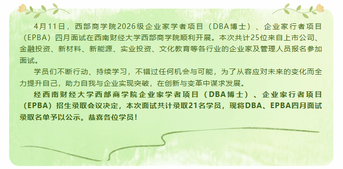 恭喜录取|西部商学院2026级企业家学者项目(DBA博士)企业家行者项目(EPBA)四月面试圆满结束